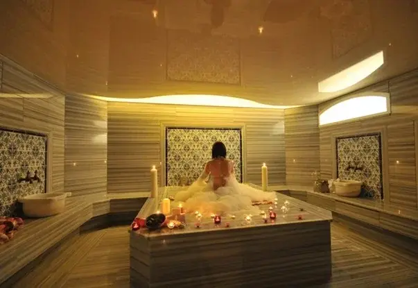 Турецкая баня: Парная с сухим паром, сауна хаммам с влажным паром, пилинг перчаткой кесе + пенно-мыльный массаж, джакузи и время для отдыха, напитки (чай каркаде, вода);