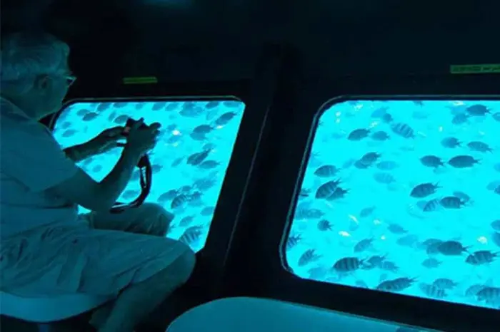 Экскурсия включает в себя: посадка на батискаф и отход в море в сторону рифов, спуск на нижнюю палубу для начала подводного путешествия (лодка НЕ погружается под воду), подъём на верхнюю палубу, пока добираетесь до места снорклинга и купания, снорклинг в море на рифе с маской и ластами.